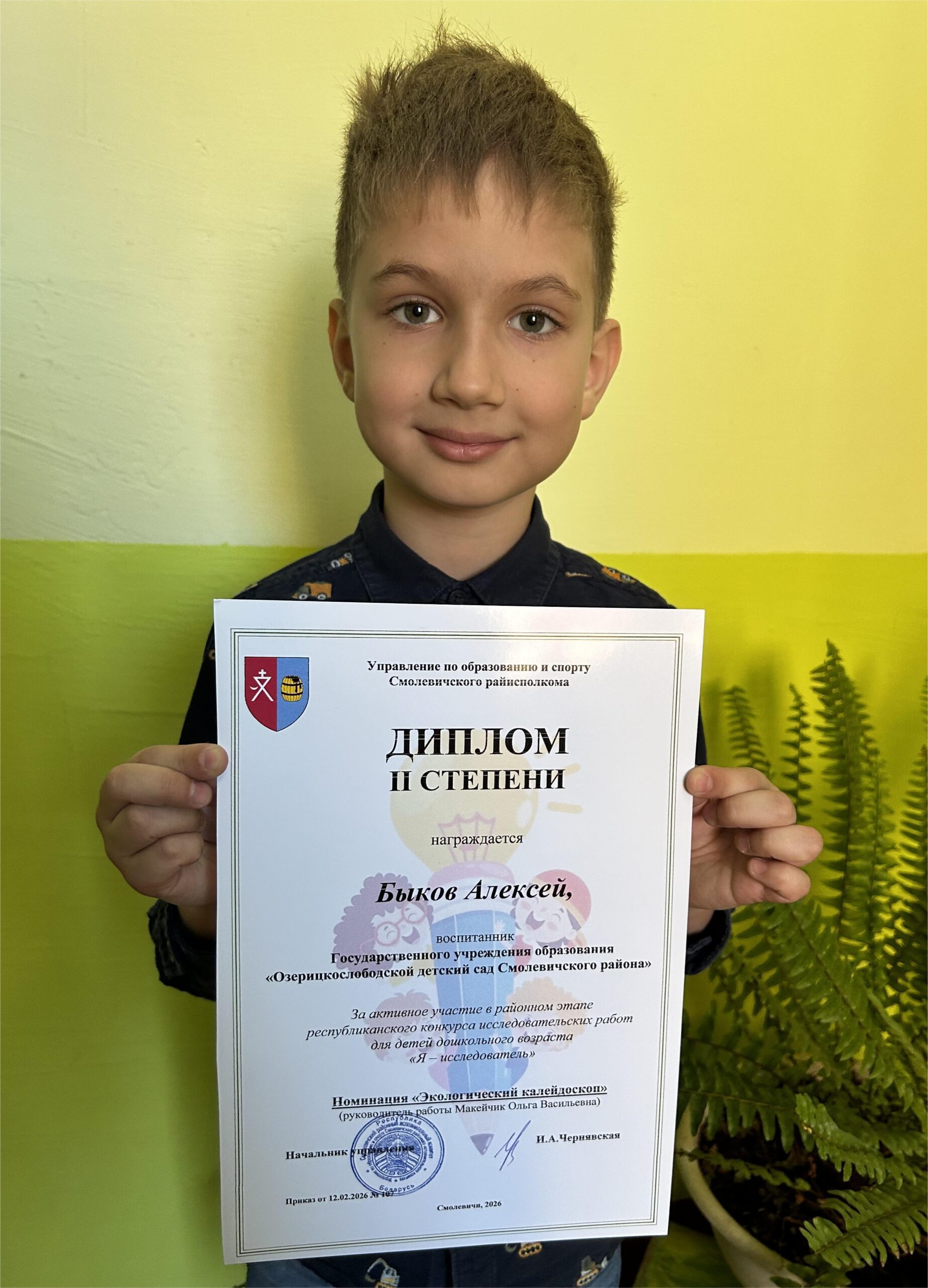 Воспитанник старшей группы Быков Алексей под чутким руководством своего воспитателя Макейчик Ольги Васильевны, стал победителем районного этапа республиканского конкурса исследовательских работ “Я – исследователь”. За свои знания и старания, Быков Алексей был награжден дипломом 2 степени в номинации “Экологический калейдоскоп”, с выступлением на тему “Зачем рыбе чешуя?”.