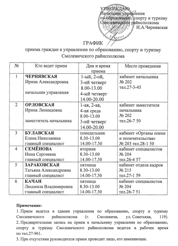 Рэжым работы Упраўленне па адукацыі, спорце і турызме Смалявіцкага райвыканкама і прыёму грамадзян з заявамі, па якіх патрабуецца ажыццяўленне адміністрацыйных працэдур: